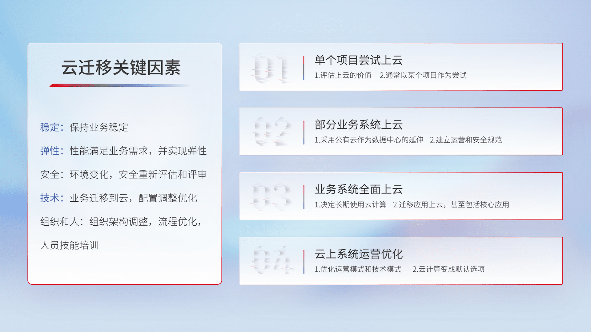 结合实际业务,,从规划设计、、、、云平台选型、、云原生改造、、、数据迁移、、、集成交付,,迁移全过程为客户识别最佳上云路径,,做好风险识别管理,,设计网络架构、、身份权限、、、、安全审计合规、、、、操作审计、、、日志审计、、、、监控告警策略、、多站点容灾设计等,,,对云上基础设施进行整体规划,,,提升IT治理水平,,,,以满足弹性、、高可用、、高性能的需求。。