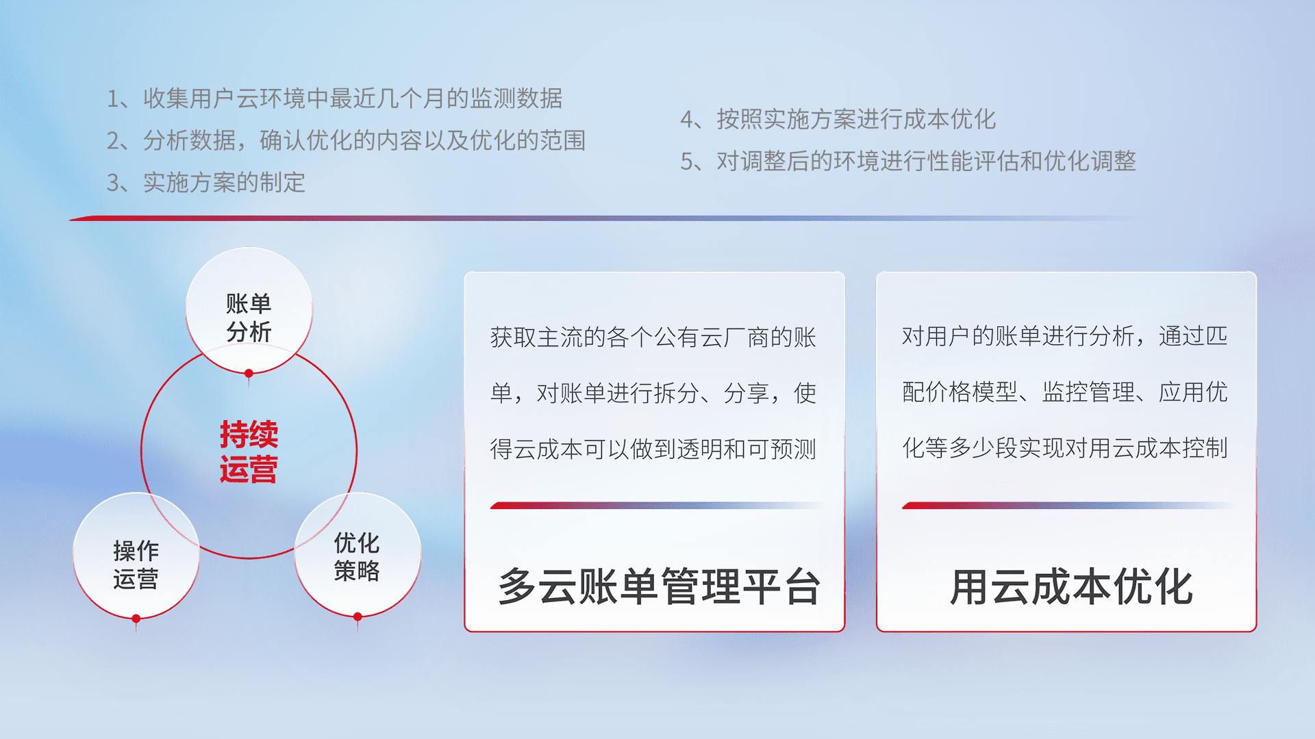通过多云纳管,,,以统一的资源数据模型把客户的云资源进行抽象和封装,,进而实现对多云资源的统一操作,,,保障云资源管理的可靠性、、、稳定性与可用性。。量身定制化运维内容,,配置、、、开发运维、、、补丁管理、、、备份、、、、监控、、认证和访问管理、、审计和日常巡检等,,,保障在用云过程中的可靠度,,,,稳定度以及高可用率。。。