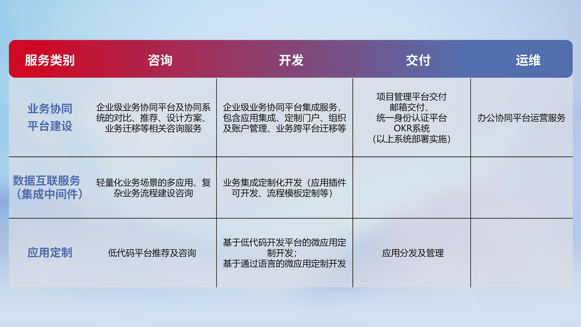 针对钉钉、、、、企微、、、IDaas等平台级产品提供产品的规划、、、、方案、、、、交付、、、定制化开发等服务,,,实现如统一协同办公、、智能客户服务、、混合会议管理、、、、智能数据查询、、、、等业务场景,,,实现数字化转型。。。。